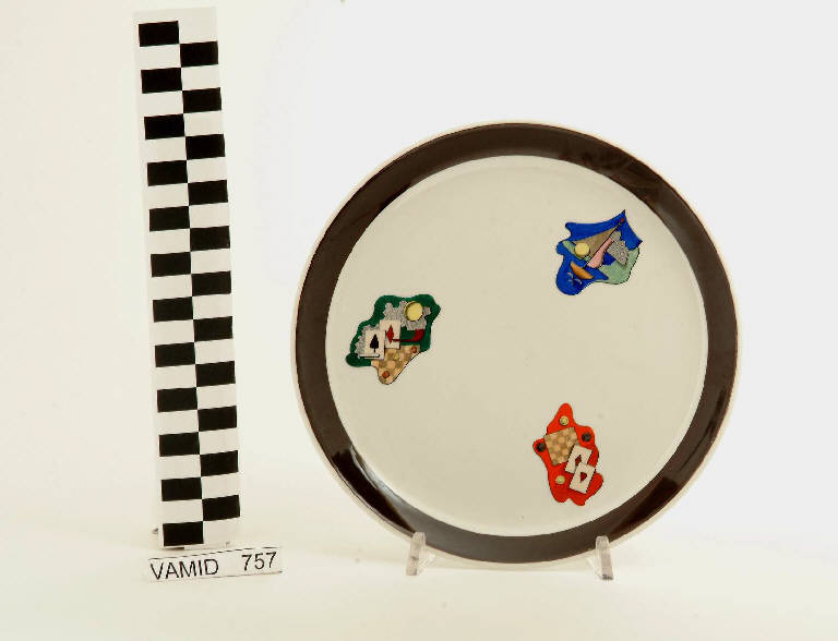 Piatto da frutta circolare privo di tesa; fondo bianco con tre specchiature mistilinee con soggetti decorativi su fondo colorato (rispettivamente una barca a vela, carte da gioco con gioco della dama, carte da gioco con gioco della dama e pipa) in posizione decentrata; fascia marrone sul bordo.