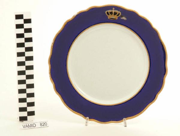 Piatto piano con orlo festonato; fondo bianco avorio; tesa in colore blu Sevrès con corona del Regno d'Italia; bordo rifinito con filettatura oro.