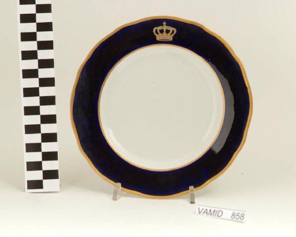 Piatto da frutta con orlo festonato; fondo bianco avorio; tesa in colore blu Sevrès con corona del Regno d'Italia; bordo rifinito con filettatura oro.