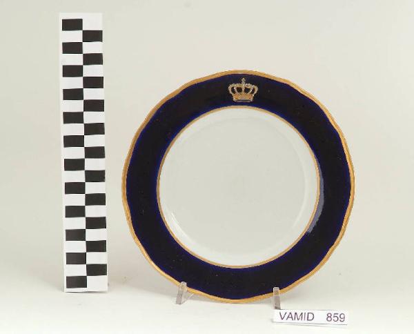 Piatto da frutta con orlo festonato; fondo bianco avorio; tesa in colore blu Sevrès con corona del Regno d'Italia; bordo rifinito con filettatura oro.