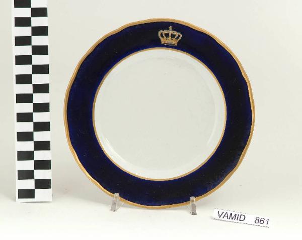 Piatto da frutta con orlo festonato; fondo bianco avorio; tesa in colore blu Sevrès con corona del Regno d'Italia; bordo rifinito con filettatura oro.