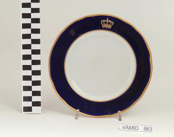 Piatto da frutta con orlo festonato; fondo bianco avorio; tesa in colore blu Sevrès con corona del Regno d'Italia; bordo rifinito con filettatura oro.