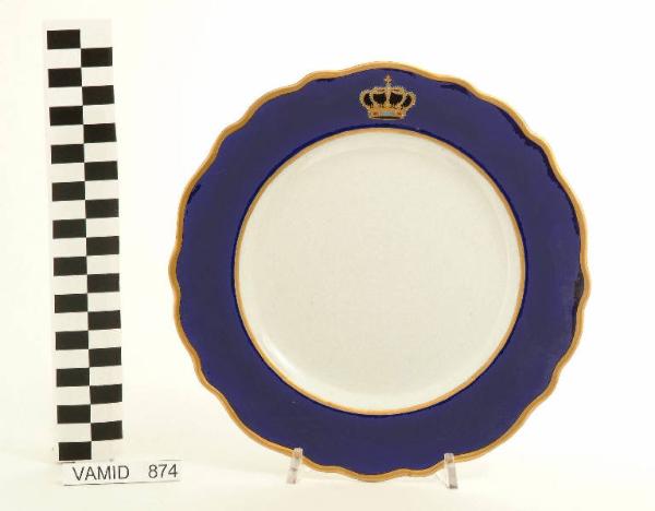 Piatto piano con orlo festonato; fondo bianco avorio; tesa in colore blu Sevrès con corona del Regno d'Italia; bordo rifinito con filettatura oro.