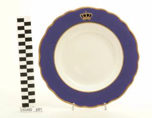 Piatto fondo con orlo festonato; fondo bianco avorio; tesa in colore blu Sevrès con corona del Regno d'Italia; bordo rifinito con filettatura oro.