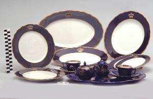 Piatto da portata ovale con orlo festonato; fondo bianco avorio; tesa in colore blu Sevrès con corona del Regno d'Italia; bordo rifinito con filettatura oro.