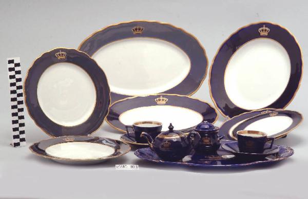 Piatto da portata circolare con orlo festonato; fondo bianco avorio; tesa in colore blu Sevrès con corona del Regno d'Italia; bordo rifinito con filettatura oro.