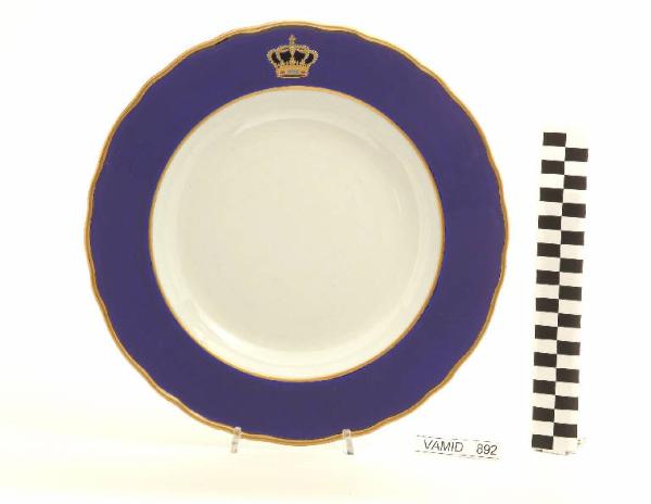 Piatto da portata circolare con orlo festonato; fondo bianco avorio; tesa in colore blu Sevrès con corona del Regno d'Italia; bordo rifinito con filettatura oro.