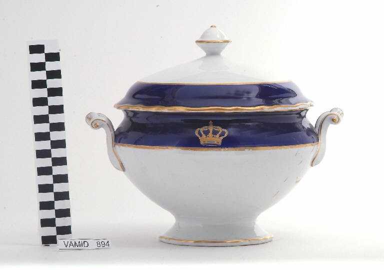 Zuppiera su piede circolare festonato; fasce sul recipienete e sul coperchio in color blu Sevrès con corona del Regno d'Italia in policromia e oro; manici a doppia voluta; coperchio festonato con pomolo romboidale; bordi rifiniti con filettatura oro.