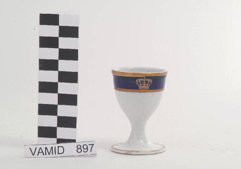 Portauovo con orli rifiniti con filettatura oro; bordo esterno in color blu Sevrès con corona del Regno d'Italia in policromia e oro.