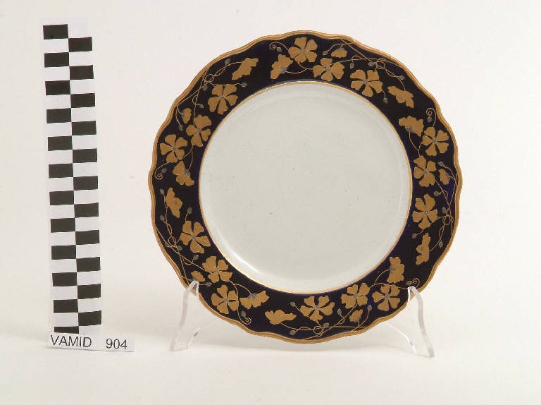 Piatto da frutta con tesa ondulata (o festonata) decorata a fiori stilizzati in oro e argento su fondo blu Sevrès. Bordo rifinito con filettatura oro brillante. Fondo e parte restrostante in pasta bianca naturale.