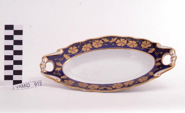 Vassoio di forma ovale con tesa ondulata (o festonata) decorata a fiori stilizzati in oro e argento su fondo blu Sevrès; due aperture ovali sulla tesa (a uso di "prese") in corrispondenza delle estremità laterali del vassoio; tali manici sono rifiniti esternamente con colute e decori in bianco e oro. Bordo rifinito con filettatura oro brillante. Fondo e parte restrostante in pasta bianca naturale.