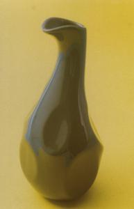 Vaso smaltato verde scuro lucido con piede circolare; collo terminante con beccuccio sporgente.
