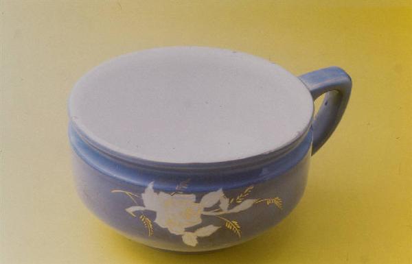 Pitale con corpo cilindrico; bordo leggermente estroflesso; manico squadrato; fondo blu cobalto decorato con mazzo di rose a risparmio e foglioline in oro all'esterno; bordo rifinito con filettatura oro; bianco internamente.