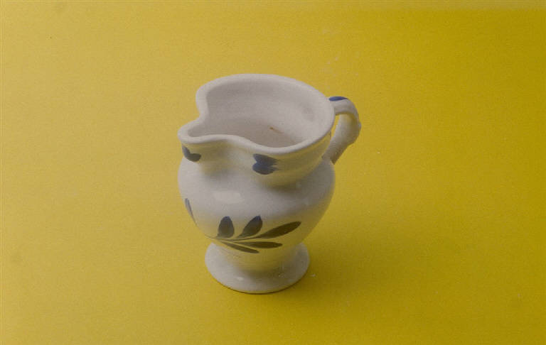 Brocca di piccolo formato di colore bianco decorata in blu con motivo a foglie.