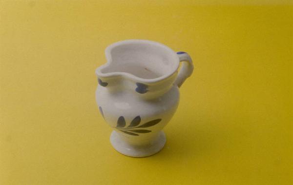 - NOTIZIE STORICO CRITICHE La piccola brocca, avente un decoro in blu cobalto dipinto a mano su fondo bianco, presenta una tradizionale foggia italiana di gusto vagamente rinascimentale. La marca Revelli presente sul fondo con la numerazione "0/ 66", forse indicativa dell'anno di produzione, permette di riferire alla stessa manifattura anche la brocca del tutto simile, a meno dlle dimensioni, avente n. inv. 1060.