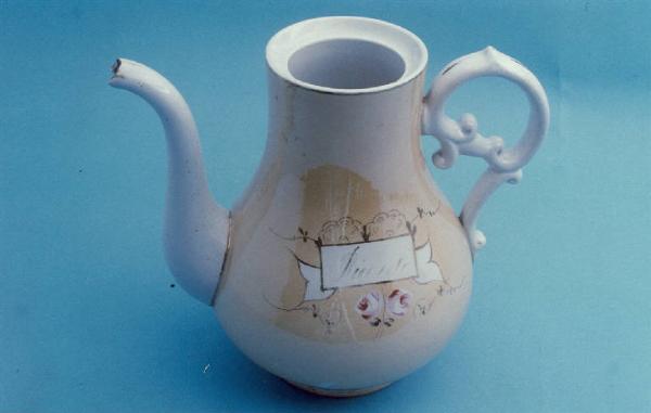 - NOTIZIE STORICO CRITICHE La caffettiera presenta un fondo pastello su cui sono tracciati esili decori floreali in rosa e oro disposti attorno a un cartiglio bianco con la scritta in oro "Ricordo". La datazione "ad annum" è possibile grazie al marchio impresso che dopo la sigla SCI reca l'indicazione dell'anno di produzione dell'oggetto. Nel MIDC sono conservate alcune ciotole con similari scritte in corsivo datate agli anni '20 del Novecento (in. nn. 1839, 1911, 1912, 1913, 1914, 1915). L'oggetto fu donato da un collezionista di Borgomanero tramite Vittorio Longobardi (cfr. scritta su foglio all'interno).