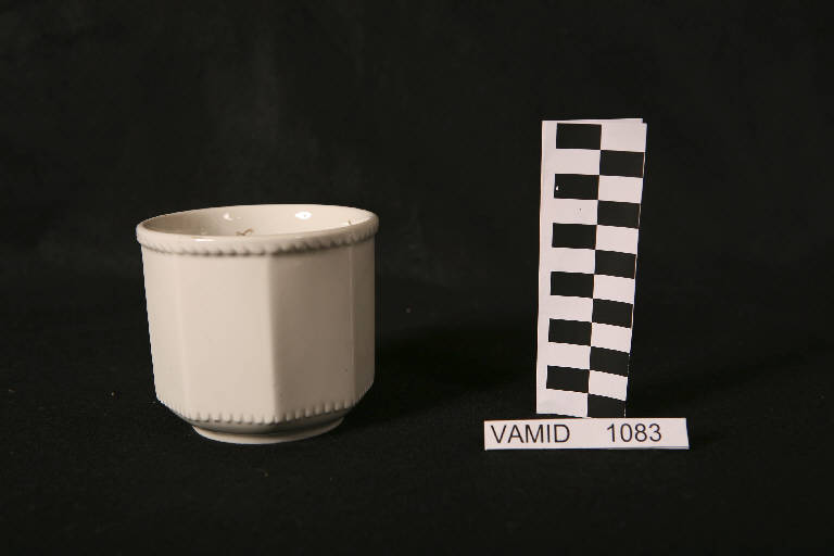 Tazza da thè a sezione poligonale, con restringimento al piede e motivo a corda sull'orlo e dentellatura prima del piede; colore bianco