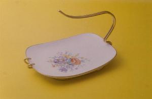 - NOTIZIE STORICO CRITICHE La foggia del portadolci è diffusa negli anni '50-'60 del secolo scorso ed è caratteristica per l'originale manico metallico pratico per offrire pasticcini e biscotti all'ora del thè.