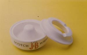 Posacenere bianco costituito da un contenitore con rialzo centrale per lo spegnimento della sigaretta e con due scritte pubblicitarie, e da un coperchio con apertura centrale, con due scritte pubblicitarie.