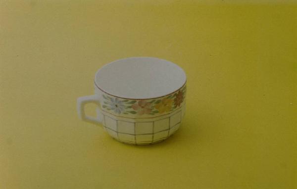Tazza da thè color avorio con piede circolare e manico rettangolare. Decorazione con motivo floreale (corona di fiori che gira intorno all'imboccatura) e geometrico (rete a maglia rettangolare). Colori: giallo, rosa, viola, azzurro e blu.