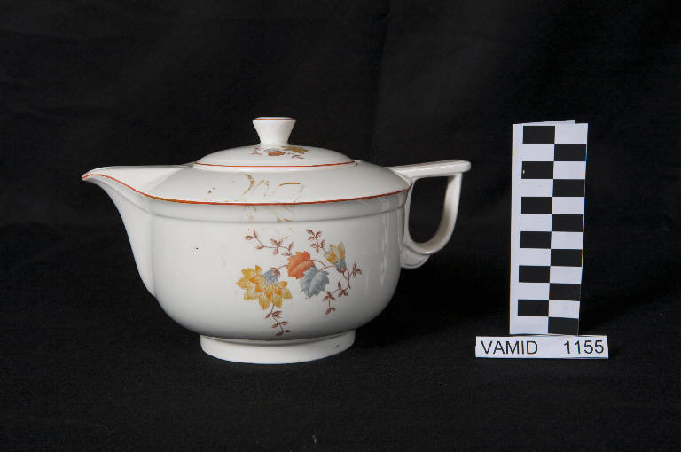 - NOTIZIE STORICO CRITICHE La teiera fa parte di un servizio da thè insieme alla zuccheriera e alla lattiera conservate al MIDC (inv. nn. 1156, 1157). L.a forma evidenza una semplificazione del modello tradizionale di teiera e un'attenzione agli aspetti ergonomici e funzionali (si veda ad esempio il robusto manico superiormente piatto per un appoggio sicuro e comodo del pollice). Anche nel decoro si reinterpreta in chiave stilizzata e semplificata una composizione a ramoscelli di fiori e foglie di tipo tradizionale. Il decoro è erealizzato con la tecnica della decalcomania sottosmalto. Tipologicamente si lega ad un servizio da tavola conservato presso il Midec (num. inv. 2981, 3654-3655).