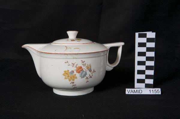 Teiera con piede circolare, corpo cilindrico con raccordo curvilineo in basso, beccuccio triangolare, manico a "staffa"; coperchio circolare con pomolo apicale a tronco di cono rovesciato; fondo bianco con filettature in rosso sui bordi e decoro a ramoscelli di foglie e fiori nei colori rosso, grigio, giallo, marrone.