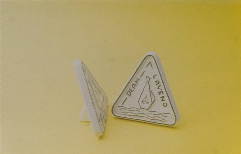 Targa pubblicitaria di colore bianco di forma triangolare con piedistallo. Raffigura marchio della Ditta Deam di Laveno in verde.