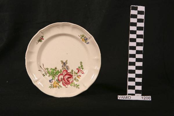 Piatto da frutta circolare con tesa ondulata e bordo leggermente arcuato e modellato con una profilatura incisa; fondo bianco avorio con mazzo di fiori policromo in posizione decentrata sul fondo e piccoli tralci fioriti lungo la tesa.