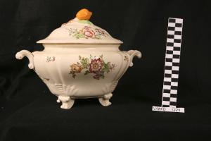 Zuppiera di forma ovale con quattro piedini a volute a "C" con motivi vegetali; corpo sagomato con motivi a ventagli a rilievo sopra l'attacco dei piedini; manici a volute a "C"; restringimento per l'appoggio del coperchio; coperchio ovale con leggera sagomatura e frutto sull'apice con funzione di pomolo; fondo bianco avorio con mazzi di fiori policromi sulle due facce principali del recipiente e sul coperchio; piccoli tralci fioriti variamente disposti.