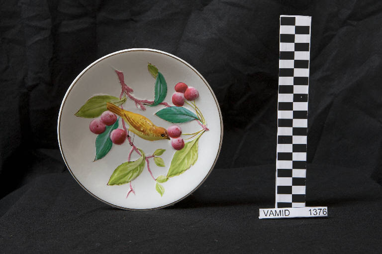 - NOTIZIE STORICO CRITICHE Il piatto, che fa parte di un servizio da frutta composto da quattro piccoli piatti e da un'alzata a rilievo raffiguranti uccellini su rami con frutti (inv. nn. 1375, 1376, 1377, 1378, 1379), è stato donato nel 1990 da Tino ed Elena De Ambroggi di Luino che ne hanno riferito la datazione al 1890 circa. Confronti con alcune opere prodotte dalla Società Ceramica Italiana, come ad esempio i piatti decorati con nature morte da Giancarlo Jacopini nel primo decennio del XX secolo, daterebbero siffatte ceramiche connotate da un gusto naturalistico vivacemente cromatico a qualche anno più tardi. L'ultimo numero del marchio impresso sull'alzata indicherebbe una fattura del pezzo e molto probabilmente dell'intero servizio al 1899.