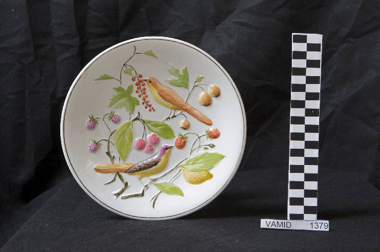 - NOTIZIE STORICO CRITICHE L'alzata da frutta, che fa parte di un servizio da frutta composto da quattro piccoli piatti e da un'alzata a rilievo raffiguranti uccellini su rami con frutti (inv. nn. 1375, 1376, 1377, 1378, 1379), è stato donato nel 1990 da Tino ed Elena De Ambroggi di Luino che ne hanno riferito la datazione al 1890 circa. Confronti con alcune opere prodotte dalla Società Ceramica Italiana, come ad esempio i piatti decorati con nature morte da Giancarlo Jacopini nel primo decennio del XX secolo, daterebbero siffatte ceramiche connotate da un gusto naturalistico vivacemente cromatico a qualche anno più tardi. L'ultimo numero del marchio impresso sull'alzata indicherebbe una fattura del pezzo e molto probabilmente dell'intero servizio al 1899.