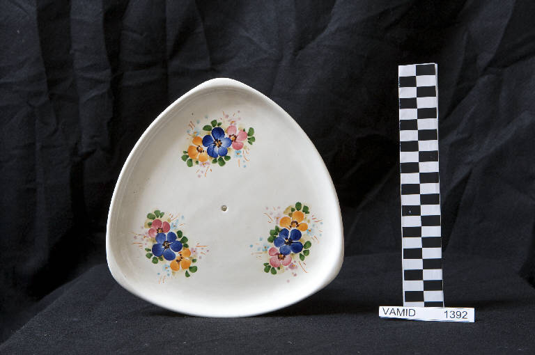 Piatto di forma triangolare con lati curvilinei; foro centrale per l'innesto del perno metallico; fondo bianco decorato con motivo floreale policromo.