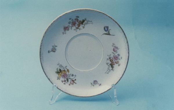 - NOTIZIE STORICO CRITICHE Il decoro floreale dell'oggetto in esame, realizzato con la tecnica della decalcomania, è di tipo tradizionale. I bouquets di fiori sono disposti regolarmente lungo la tesa. Una greca dorata rifinisce il bordo. Nel Museo delle Terraglie di Laveno è presente un portadolci con il medesimo decoro (num. inv. 1137)