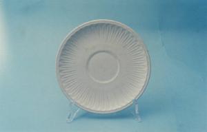 Piattino circolare con motivo a rilievo; fondo bianco.