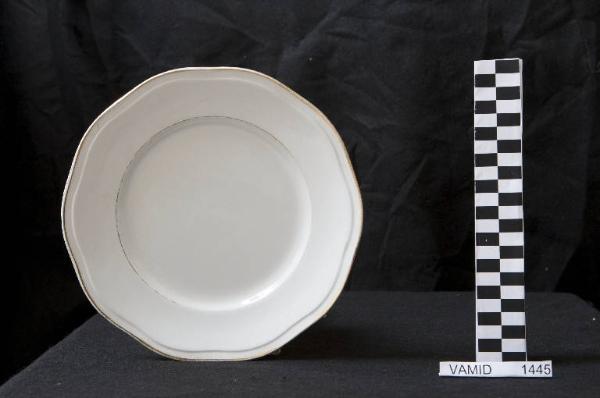 Piatto piano con orlo ondulato; fondo bianco; bordo rifinito con filettatura oro.