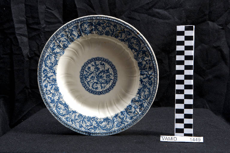 Piatto fondo con bordo sagomato a rilievo; fondo bianco con motivi decorativi vegetali in blu lungo la tesa e nel centro del cavetto.
