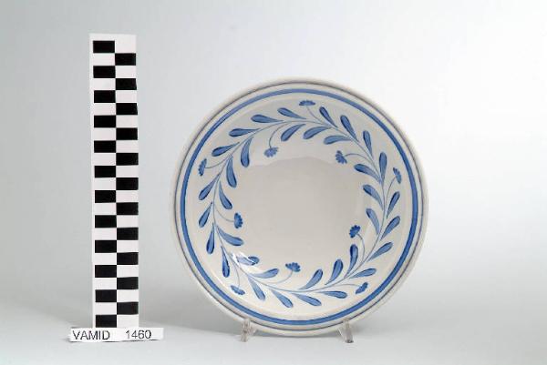 Piatto fondo circolare senza tesa; fondo bianco con motivo decorativo vegetale a ghirlanda in blu lungo l'ala; bordo rifinito in blu.