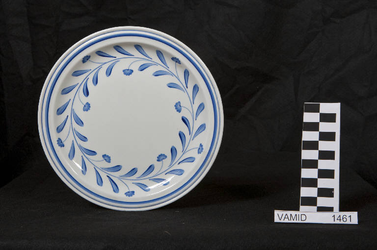 Piatto da frutta circolare senza tesa; fondo bianco con motivo decorativo vegetale a ghirlanda in blu lungo l'ala; bordo rifinito in blu.