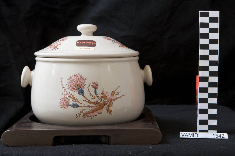 Zuppiera con recipiente a forma circolare; pomoli laterali di forma circolare leggermente schiacciati; coperchio con pomolo sommitale circolare leggermente schiacciato; fondo bianco avorio con motivo floreale stilizzato policromo su recipiente e su coperchio.