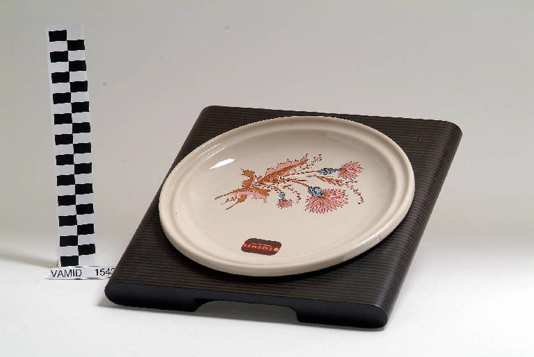 Piatto piano circolare senza tesa con bordo rialzato; fondo bianco avorio con motivo floreale stilizzato policromo in posizione decentrata sul fondo.