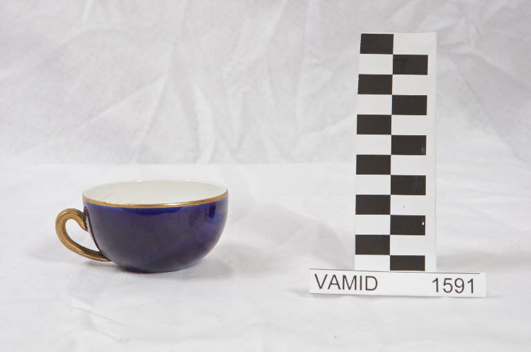 Tazza da caffè di forma concava; manico a "C"; colore blu cobalto con rifiniture e manico in oro; bianco internamente.