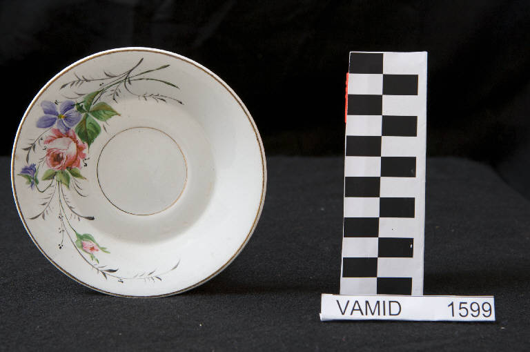 Piattino circolare; fondo bianco avorio con mazzo di fiori policromo in posizione decentrata sul fondo; bordo rifinito con filettatura oro.