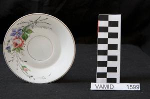 • NOTIZIE STORICO CRITICHE Il piattino in esame, facente parte di un servizio da caffè (nn. inv. 1598-1602), è decorato con un motivo floreale dipinto a mano sottosmalto. Lo stile naturalistico, di minuziosa mimesi della realtà, con effetti tridimensionali e luministici indica una datazione all'inizio del Novecento. Il numero finale presente a tergo potrebbe indicare la data di fabbricazione (1908): tuttavia, in mancanza di dati certi, si preferisce mantenere una datazione generica.