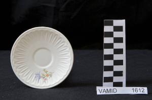 Piattino circolare con motivo a rilievo; fondo bianco decorato con bouquet florale policromo in posizione decentrata sul fondo.
