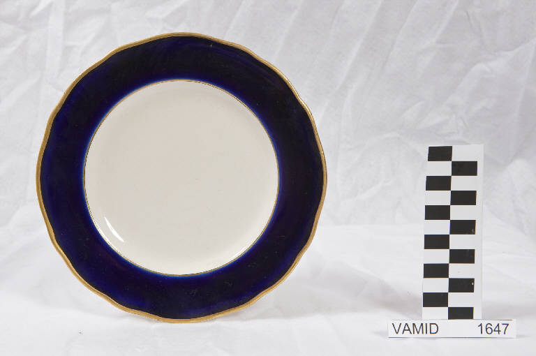 - NOTIZIE STORICO CRITICHE La foggia con orlo festonato e tesa in colore blu Sevrès si ritrova anche in un servizio da tavola (nn. inv. 2425-2438), già appartenuto agli Scotti Meregalli di Laveno, prodotto dalla S.C.I. nel 1923 ca. per il Re d'Italia. Il confronto stilistico con il piatto in esame, privo della corona regale sulla tesa, indica una datazione tra gli anni '20 e '30 del Novecento. La mancanza di ulteriori elementi decorativi impedisce una definizione cronologica ancora più circoscritta.