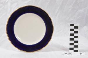 Piatto da frutta con orlo festonato; tesa in colore blu Sevrès; bordo rifinito con filettatura oro.