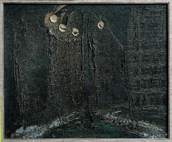 - NOTIZIE STORICO CRITICHE Tra i quadri "milanesi" dell'inverno del '68, numerosi sono quelli riferiti a piazza San Babila, presso cui era allora situato lo studio dell'artista. Come sempre, Congdon fissa la propria attenzione sui punti nevralgici dell'organismo urbano: in questo caso sul centralissimo slargo di cui è messo in risalto lo spazio angusto e anonimo, soffocato dagli alti torrioni dei palazzi che chiudono quasi ogni accesso al cielo notturno e spento. La vita si concentra nei palloni luminosi e surreali del gigantesco lampione che fa da asse centrale del quadro e nel fiume luccicante del traffico. Occorre osservare la particolare qualità dei pigmenti, ottenuta mescolando fuliggine al colore ad olio, la cui densità opaca anticipa la serie "Bombay" del '73, anch'essa similmente riferita ad uno scenario di traffico urbano.