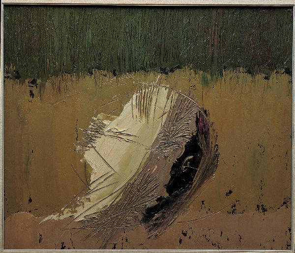 - NOTIZIE STORICO CRITICHE I volatili sono un soggetto ricorrente nella pittura di Congdon e questa serie del "Piccione Morto", è simbolicamente connessa ai temi della violenza e della morte. La stessa coincidenza di eventi, che di questi dipinti è stata occasione ispiratrice (l'uccisione di un piccione vicino all'abitazione assisiate e la notizia dell'assassinio di Robert Kennedy), è, in tal senso, emblematica. La superficie del dipinto è ripartita in tre fasce orizzontali, dai colori straordinariamente caldi e luminosi, tra cui spicca la preziosissima nota verde della fascia superiore. Il dramma si concentra nella massa del piccione, cui il movimento rotatorio conferisce una forma vagamente circolare. Si ha così una singolare contaminazione con il tema del disco - altro motivo forte della pittura congdoniana - qui riproposto nella sua versione divisa in due, con un trascolorare dal bianco al nero. Oltre che dal contrasto cromatico, l'impressione di violenza è suggerita dal movimento convulso delle incisioni.