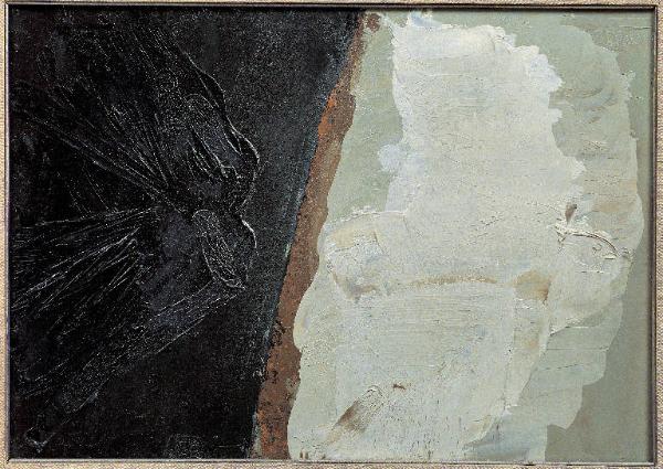 - NOTIZIE STORICO CRITICHE La lunga serie dei Piccione morto, dipinta ad Assisi nella tarda primavera del 1968 (e ispirata all'assassinio di Robert Kennedy), trova un ulteriore sviluppo quando l'artista si trasferisce, alla fine di luglio, nello studio di Subiaco. Come denuncia anche il titolo, l'intento simbolico è, rispetto alla serie precedente, più scoperto. E più esplicita anche la volontà di riallacciarsi a immagini di precedenti stagioni, come quelle degli Avvoltoi del Guatemala del '57. La superficie del dipinto, priva di preparazione, è partita in due da una linea obliqua verticale che lascia trasparire la masonite sottostante. La parte sinistra è ricoperta di pigmento nero sul quale il modellato della spatola abbozza la forma del volatile, con il suo tessuto di penne. La stessa cosa avviene nella parte destra, ma su una massa di bianco che verso i bordi trascolora nel beige.