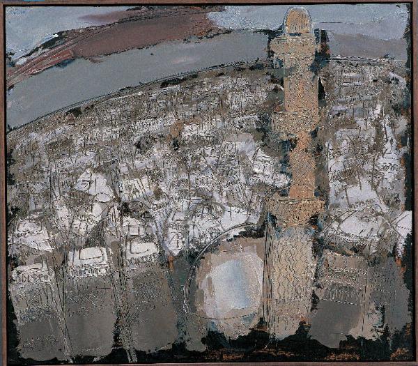- NOTIZIE STORICO CRITICHE Arrivato a Sana'a, Congdon si confronta nuovamente con il tema del monumento; egli viene infatti attratto dall'aspetto consunto e logoro degli antichi palazzi della città yemenita. Questo particolare approccio, che elude, appunto, la magnificenza e lo splendore dell'architettura, corrisponde a una necessità di dipingere non tanto i luoghi rappresentativi della storia, ma il tempo della storia, reso esplicito e visibile nel «disordine dei secoli». Come i maggiori deittici del pianeta venivano resi attraverso «una spazialità straniata, inquietante, in perenne bilico», la candida magia dei palazzi «merlettati di finestre» diviene, nella presa dall'alto del minareto, un brulichio confuso e instabile di architetture "bianco sporco" sul punto di sprofondare e implodere nelle loro stesse macerie.